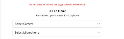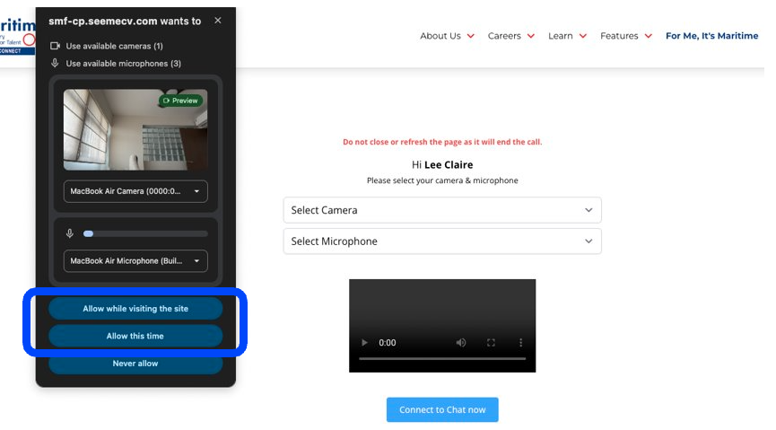 - If this is your first time on this page, you may see a pop-up requesting access to your camera and microphone. Click Allow for both camera and microphone permissions.