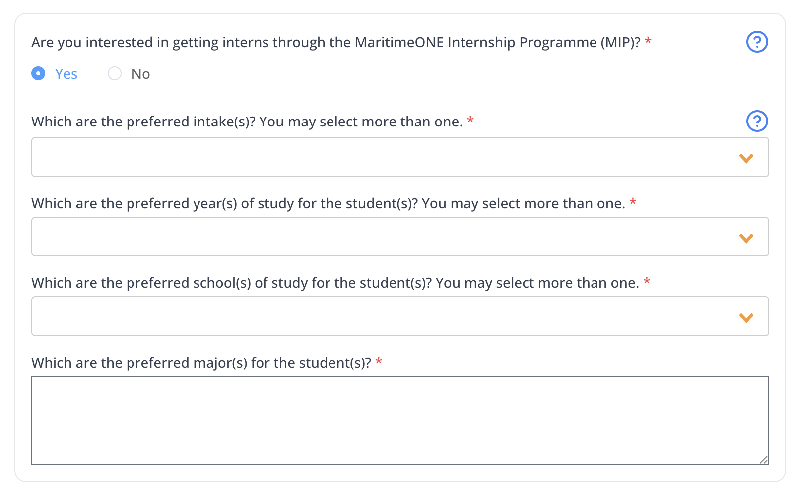 - Under the question “Are you interested in getting interns through the MaritimeONE Internship Programme (MIP)?”, select Yes.